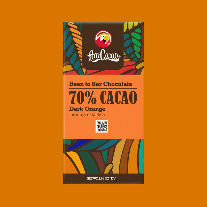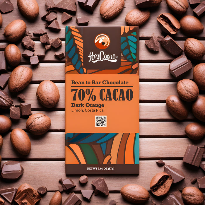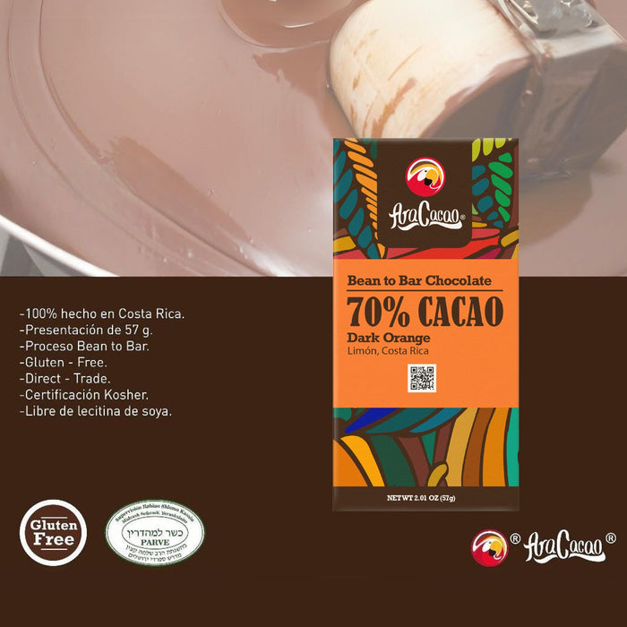 AraCacao | Bean to Bar | 70% Dark Orange Chocolate | Gluten-Free | Kosher Certified | Free of Soy Lecithin | Made in Costa Rica | 57g