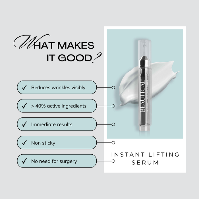 - LIGHT TEXTURE: Unlike other lifting serums, BEAUTICAL serum has a light texture that is immediately absorbed into the skin. This quick absorption ensures visible and instant anti-wrinkle effects, without any residue or stickiness. Its silky smooth texture makes it ideal as a primer.