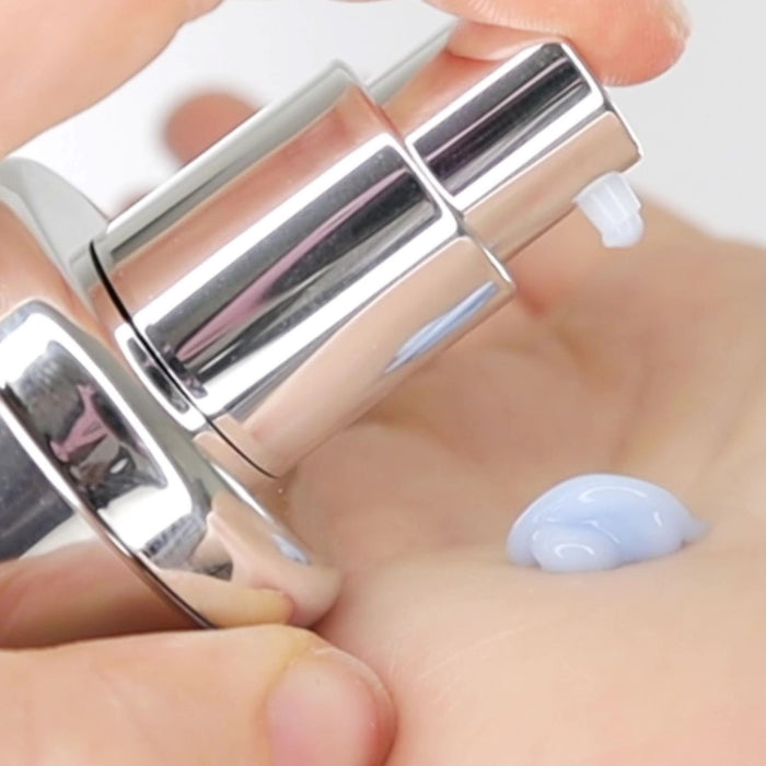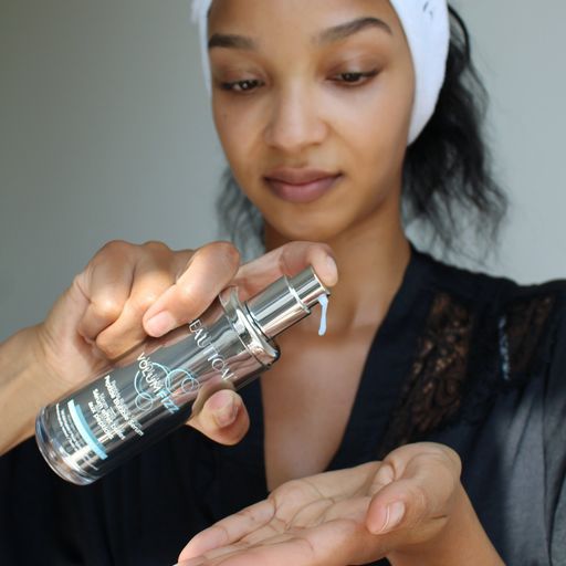 Apply 4 pumps of serum over the entire face and neck area, on clean and dry skin. Gently spread the serum on the skin, without pressing or rubbing, and wait for the bubbles to form. Wait until the bubbles begin to dissipate, then lightly massage the remaining serum into the skin.