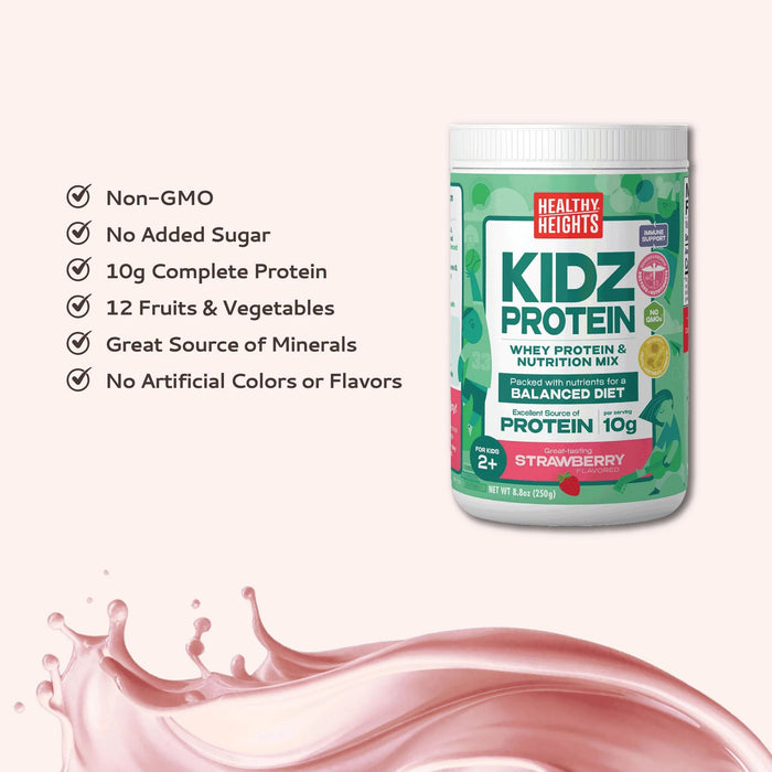 Healthy Heights KidzProtein, specially formulated protein powder shakes designed for children ages 2+ years old. Premium childrens nutrition is our mission, all our products are developed by pediatricians, and formulated to provide supplemental nutritional support for a balanced diet. Available in delicious Chocolate, Vanilla and Strawberry, enriched with fruits and vegetables and Omega 3s. Our KidzProtein shakes taste great and are an excellent source of protein, vitamins, and minerals each serving is packed with 10 grams of protein and essential nutrients for a balanced diet and immune support including zinc, iron, calcium, magnesium, and B vitamins, and vitamins A,C,D,E. Perfect for picky eaters, active children, or parents who have concerns about their childs diet. Kid-approved taste and nutrition parents trust. Our products are free from corn syrup, gluten, peanuts, soy, artificial flavors and colors and contain no GMOs.