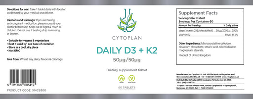 Cytoplan1 reviewOriginal price $0.00 - Original price $0.00Original price $0.00$23.23$23.23 - $23.23Current price $23.23| /In stockDaily D3 + K2 is a lower potency vitamin D3 and K2 combination supplement. It is ideally used in conjunction with any of our multivitamin and miner...