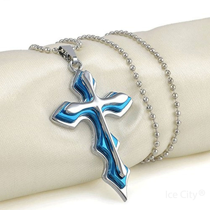 The Ice City Silver and Blue Cross Pendant Necklace is a striking piece of men's fashion jewelry. Featuring a sleek cross pendant in silver and blue, this necklace is both stylish and durable. With its polished finish and secure lobster clasp, it's comfortable for everyday wear and perfect for adding a touch of elegance to any outfit.